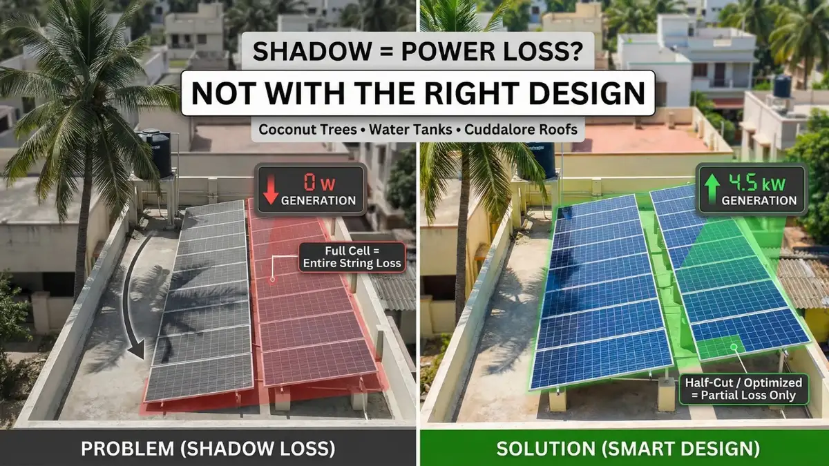 - Half-Cut Panel: The bottom half stops, but the Top Half keeps working at 100%. Instead of generating 0 Watts, you generate 270 Watts. For Cuddalore homes with cramped roofs and high parapet walls, Half-Cut panels are non-negotiable.
